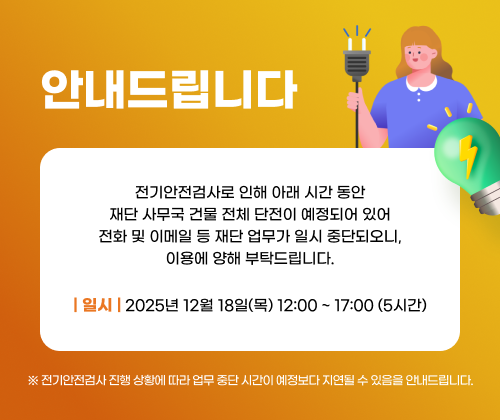 재단 사무국 건물의 전기 안전 검사 관계로 약 5시간 가량 단전됩니다. 전기 검사 시..