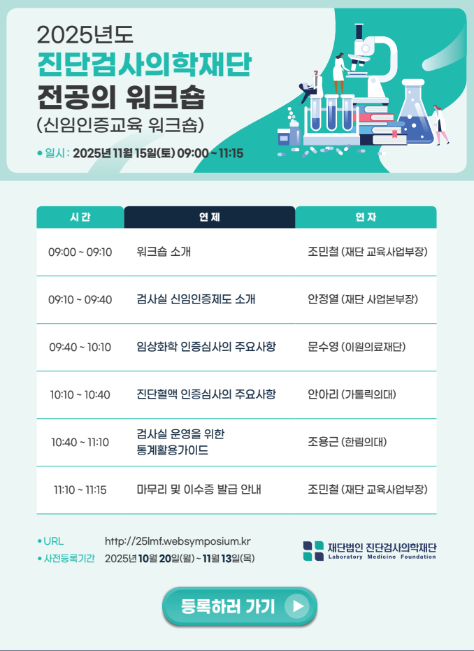 2025년도 진단검사의학재단 전공의 워크숍(신임인증교육 워크숍)을 개최하오니 전공의 분들의 많은 관심과 참여 바랍니다.